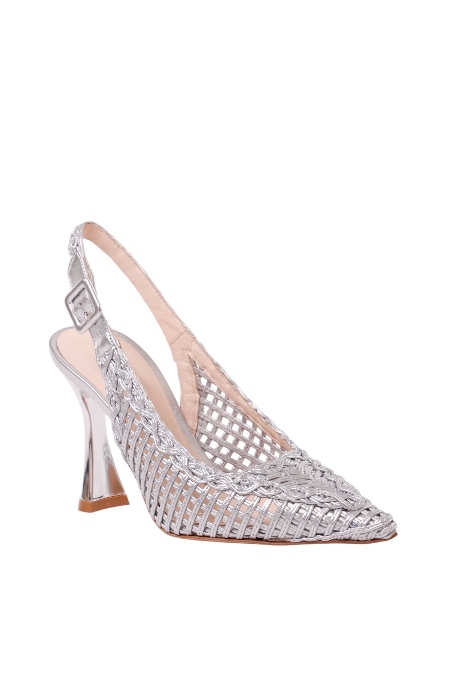 Daring, dazzling, and designed to captivate—Luna in silver woven channels high-impact glamour with refined artistry. Handcrafted in Italy, this slingback heel features an intricate metallic weave that plays with texture and light, creating an ethereal silhouette. The sharply pointed toe elongates the leg, while the sculptural flared heel delivers modern elegance and lift. Finished with a secure ankle buckle and soft leather lining, Luna is your statement shoe for nights out, celebrations, or anytime you want to shine.