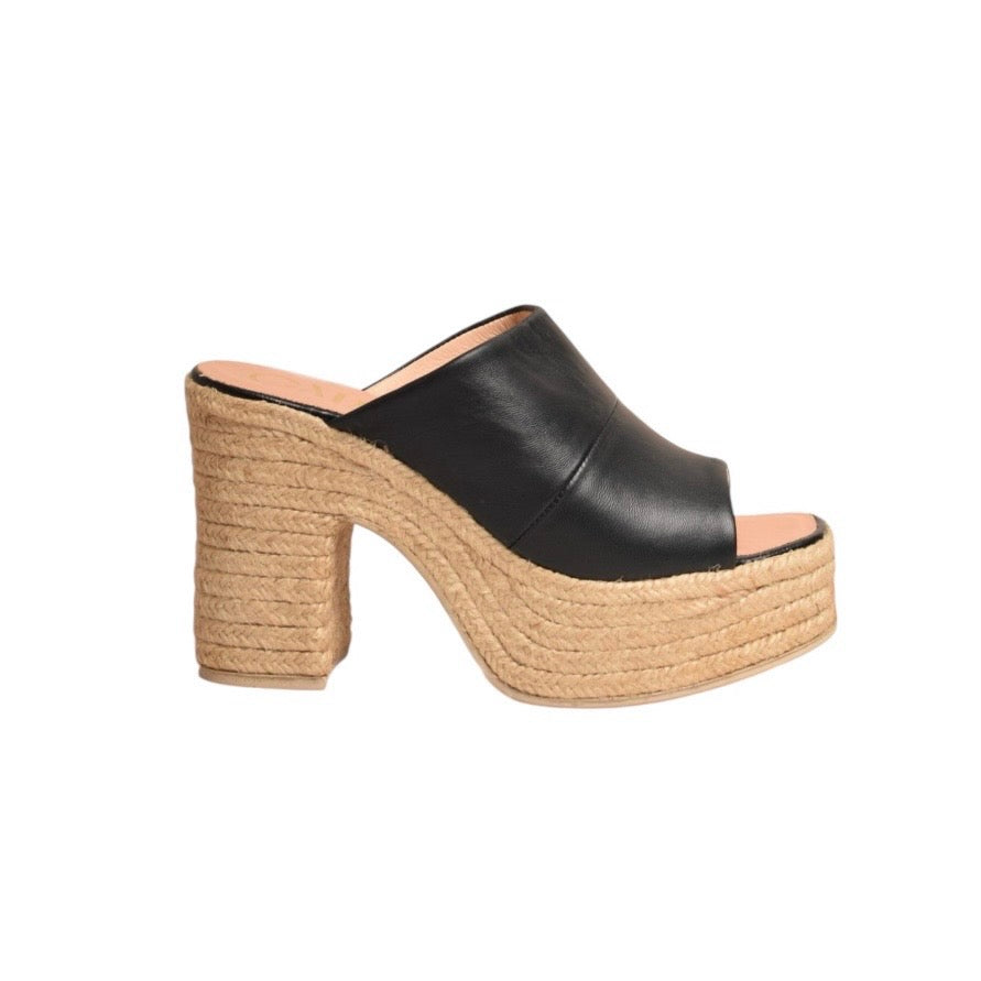 Bold and breezy, Dunas in black leather channels effortless confidence with a sculptural twist. Set on a wide, eco-conscious jute platform and heel, this handcrafted mule offers grounded height and easy slip-on wear. The soft leather upper hugs the foot with clean lines, while the open toe adds a touch of summer allure. Made in Spain, Dunas blends modern polish with earthy texture—your go-to for sun-drenched days and casual refinement.