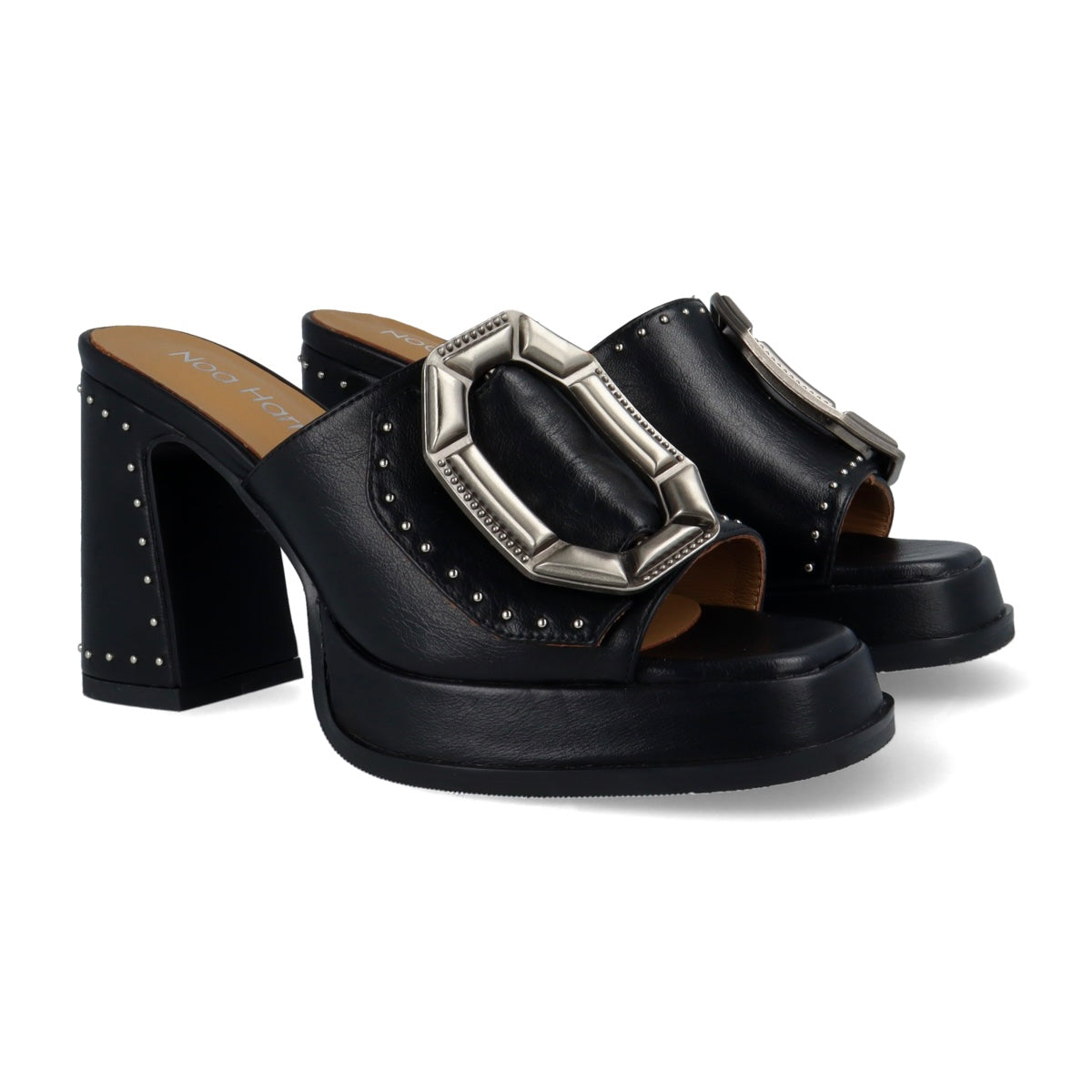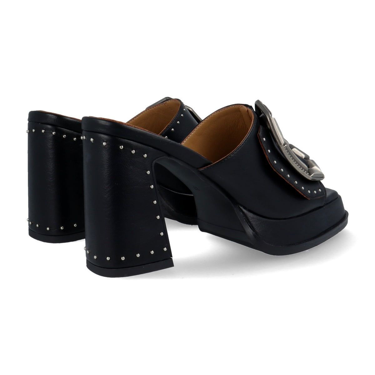 Powerfully grounded yet unapologetically bold, Juno in black leather redefines the statement mule. Featuring a chunky platform heel, oversized silver chain hardware, and studded accents, it’s built for fearless steps. The open toe adds a touch of ease, while the contoured footbed ensures wear-all-day comfort. Juno is your go-to for adding edge to sleek tailoring or elevating laid-back denim—commanding, cool, and always in control.