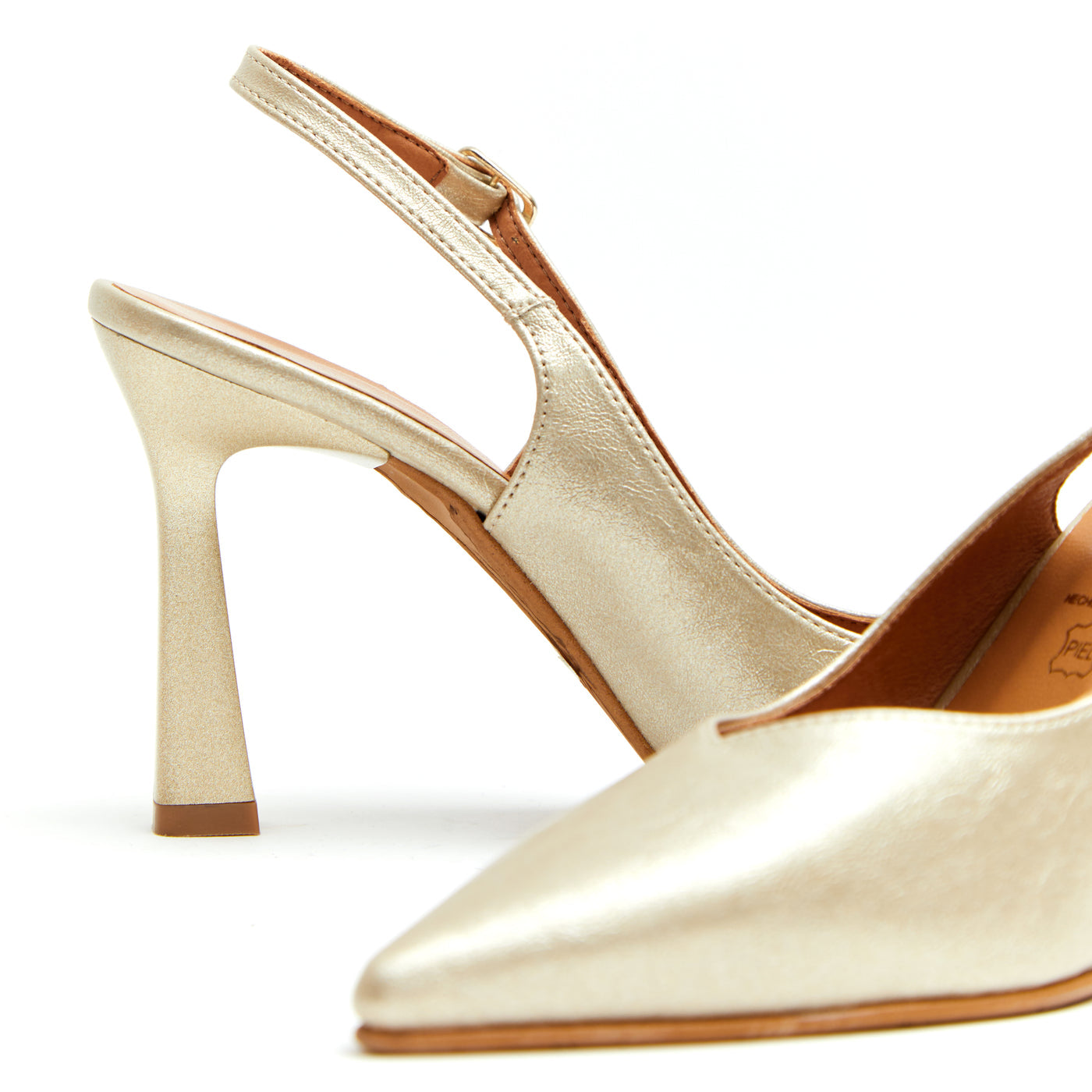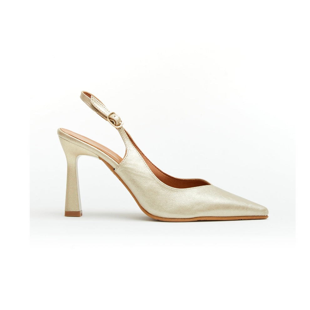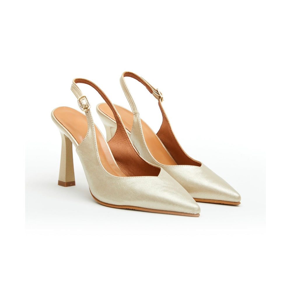 Refined and radiant, Livia in Champagne is your go-to heel for elevated moments. Designed with a sculptural flared heel and a sharply pointed toe, she blends modern sophistication with timeless grace. The soft, champagne-toned metallic leather shimmers with every step, giving texture and light to your look. A delicate slingback strap finishes the silhouette, offering a secure fit without sacrificing elegance. Livia isn’t just a shoe — she’s a statement.