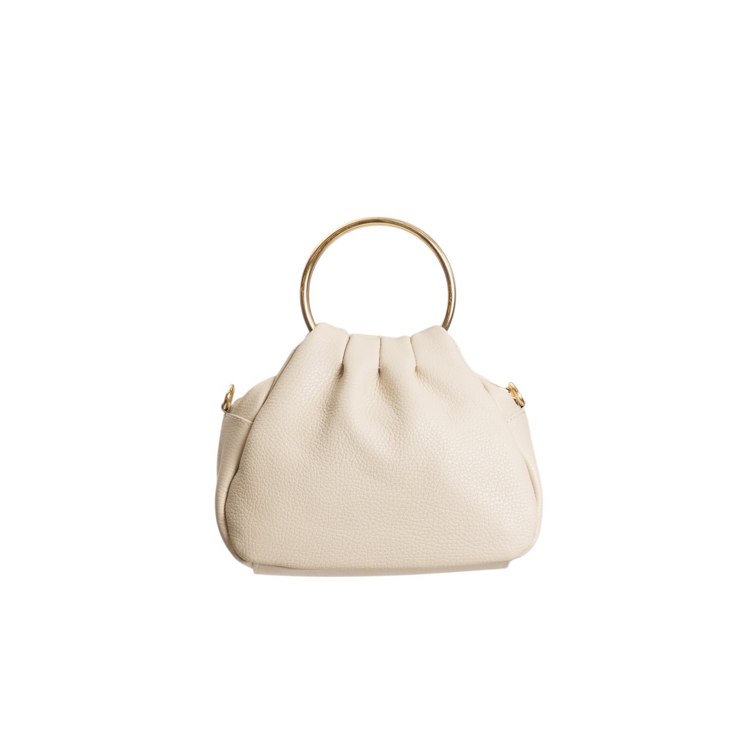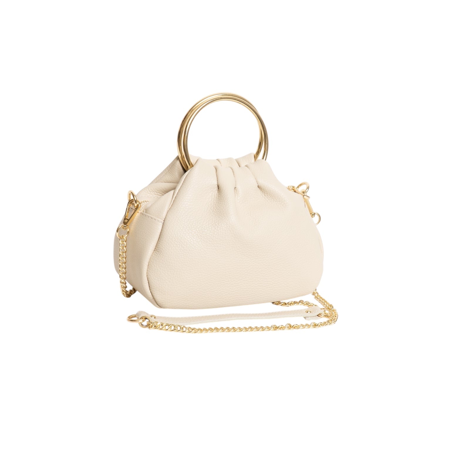 Elevate your essentials with the Milana bag in timeless off-white. Crafted from premium pebbled leather, it showcases a softly ruched silhouette accented by gleaming gold ring handles and a removable chain strap. Effortlessly graceful, this bag transitions seamlessly from day to night.