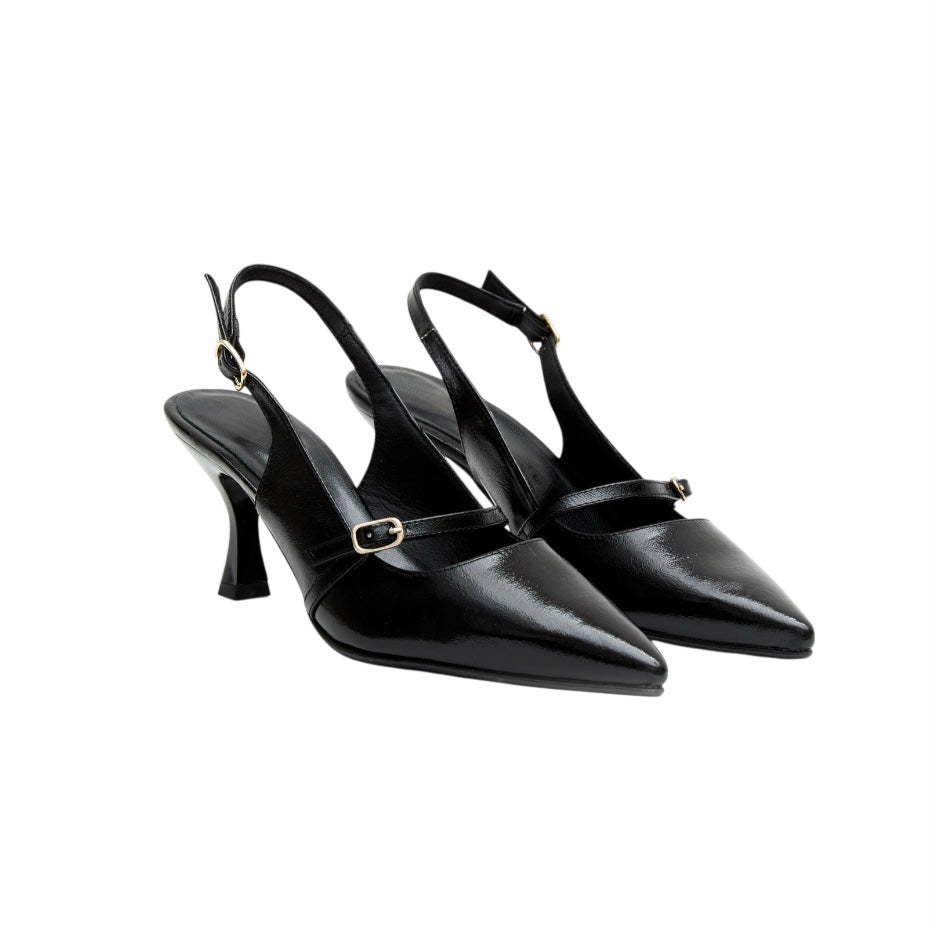 Elegant by nature, daring by design—Nina in black patent is a modern classic. With its sharply pointed toe, slim strap detail, and sculpted mid-heel, this slingback brings polish with an edge. The high-shine finish adds a refined allure, while the comfortable silhouette moves with ease from boardroom to evening rendezvous. Whether paired with tailored trousers or a slip dress, Nina makes quiet power feel effortless.